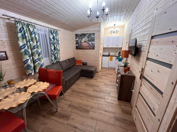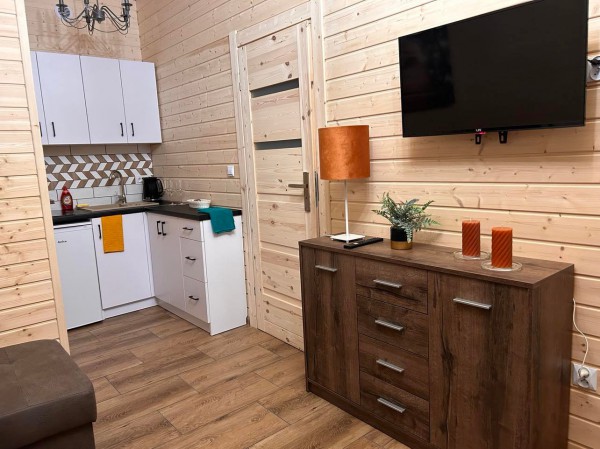 - salon z kanapą z funkcją spania oraz aneksem kuchennym w pełni wyposażonym